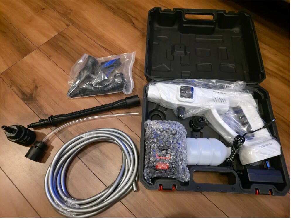 ホース、洗剤用ボトル、各アタッチメント、バッテリーと充電器も入っており、追加で必要なのは水を入れるものだけです。バケツやペットボトルがあればすぐに使用できます。